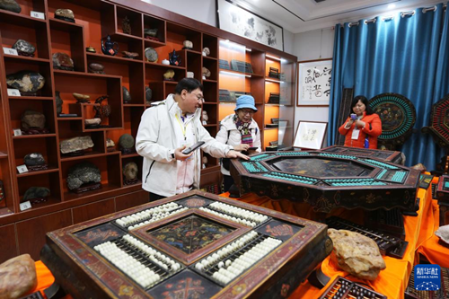 10月14日,游客在程万里的算盘非遗体验基地观看各种算盘。(王克贤 摄)