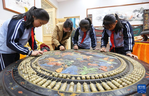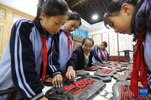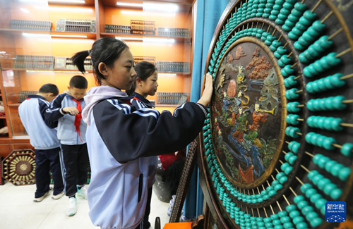 10月14日,陇西县红星小学学生在程万里的算盘非遗体验基地参观。(王克贤 摄)